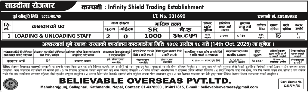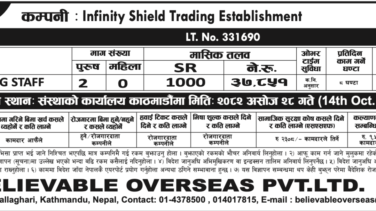 Vacancy in Infinity Shield Trading Establishment by Believeable Overseas October 7, 2025 Jobs Vacancy in Infinity Shield Trading Establishment
